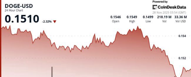 试图在$0.151附近稳定的努力反复失败,使该区域成为直接的上方阻力。在会议结束时,DOGE在$0.1500以上横盘整理,缩小的波动范围和下降的交易量暗示暂时的疲软,但没有确认的反转。