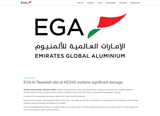 北京时间周六深夜,阿联酋环球铝业(EGA)发布公告称,当天早些时候,其位于阿布扎比哈利法经济区的塔维拉生产基地遭到伊朗导弹和无人机袭击,并遭受严重破坏。