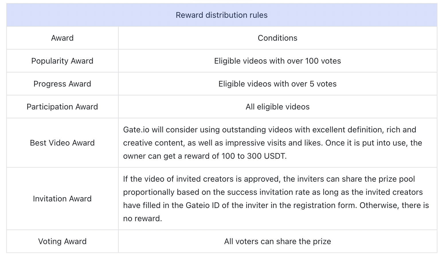 Mỗi người dùng xác thực tên thật (KYC) hợp lệ có thể nhận được tới 1/3 tổng giải thưởng của Giải thưởng nổi tiếng và Giải thưởng hấp dẫn, 1/30 tổng giải thưởng của Giải thưởng tham gia, 1/25 tổng giải thưởng của Giải thưởng Mời, 1/100 tổng giải thưởng của Giải thưởng Bình chọn , phần thưởng chất lượng không có giới hạn trên.