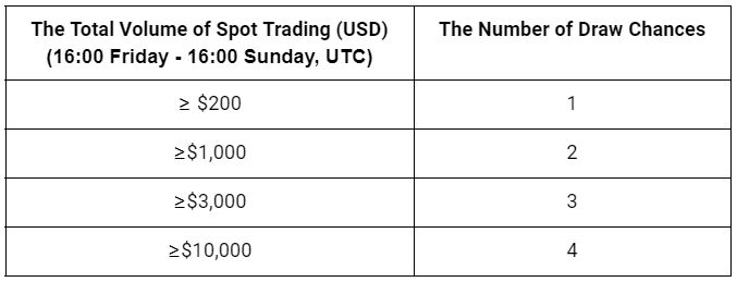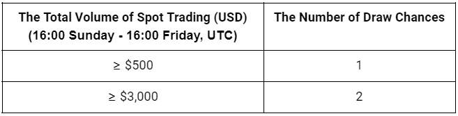 With a total of $500 and more in spot trading from 16:00 UTC on Sunday to 16:00 UTC on Friday, participants will receive 1 draw chance as soon as the campaign starts. When the total trading volume hits $3,000 and more, participants will receive 2 draw chances.