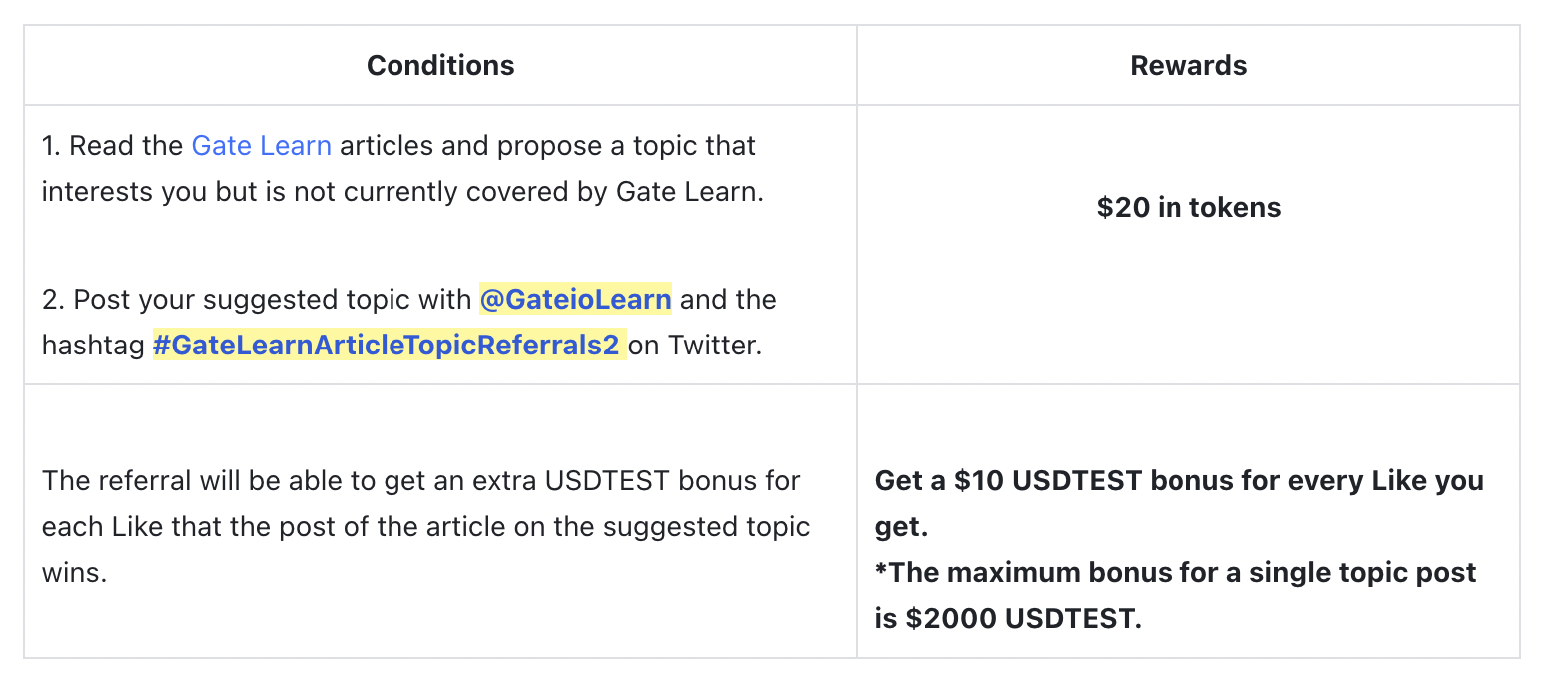 @GateioLearn Twitter. The referral will be able to get a bonus of $20 USDTEST for each Like that the post wins. The more the number of likes, the more the bonuses, with a maximum bonus topping at $2000 USDTEST.