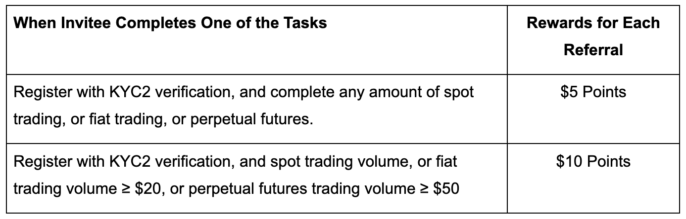 Refer a new user to register with KYC2 verification and complete the tasks, and you will win rewards and enjoy up to 40% trading fee commission for each invitee.