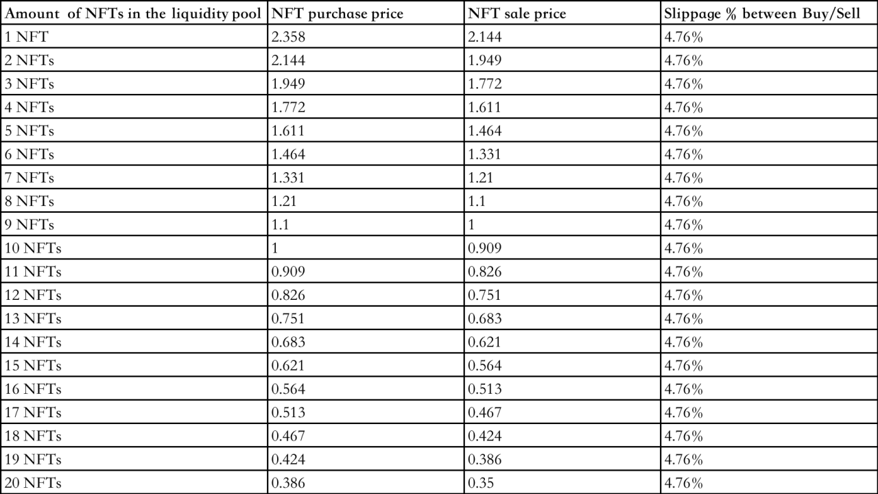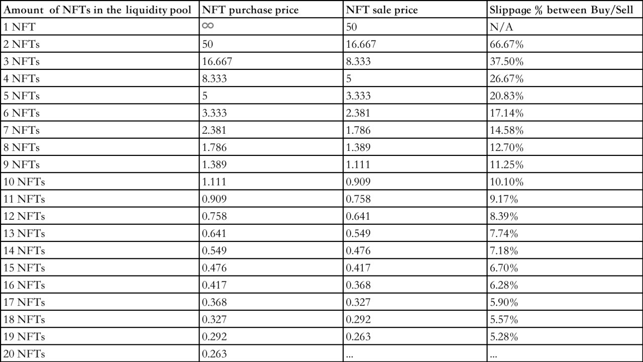 ومع ذلك، إذا انخفض عدد NFTs في المجمع بشكل كبير بسبب الشراء والبيع المستمر، فقد يتباين السعر بشكل حاد. على سبيل المثال، إذا كان هناك 2 NFTs فقط متبقية في المجمع، فسيرتفع سعر الشراء إلى 50 ETH، بينما مع 10 NFTs متبقية في المجمع، سيكون سعر الشراء 1.111 ETH. ولذلك، فإن استخدام خوارزمية المنتج الثابت قد لا يكون طريقة التسعير الأكثر فعالية لـ NFTs، حيث يكون العرض محدودًا وفريدًا.