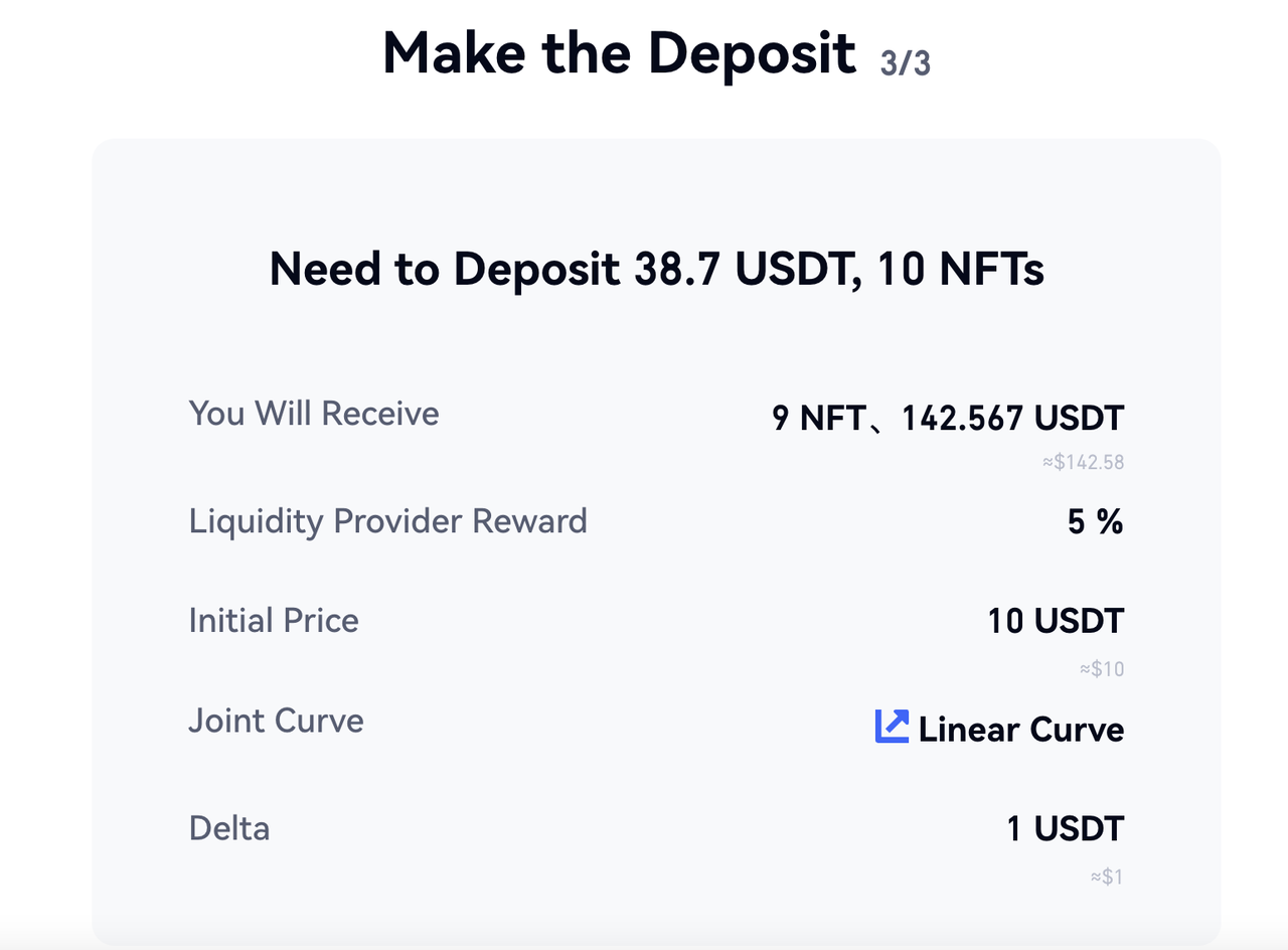 على سبيل المثال، في حالة Uniswap، يُطلب من مزودي السيولة إيداع رمزين مكافئين في مجمع السيولة، مثل 50% ETH و50% DAI في مجمع ETH/DAI. من ناحية أخرى، تتطلب NFT AMM من LPs إيداع مبلغ معين من NFT وما يعادلها من الرموز المميزة في مجمع أموال السيولة. على سبيل المثال، يمكن لشركة LP إيداع قطعة واحدة من BAYC و100USDT في صندوق أموال BAYC/USDT، على افتراض أن سعر السوق لـ BAYC هو 100USDT في ذلك الوقت.