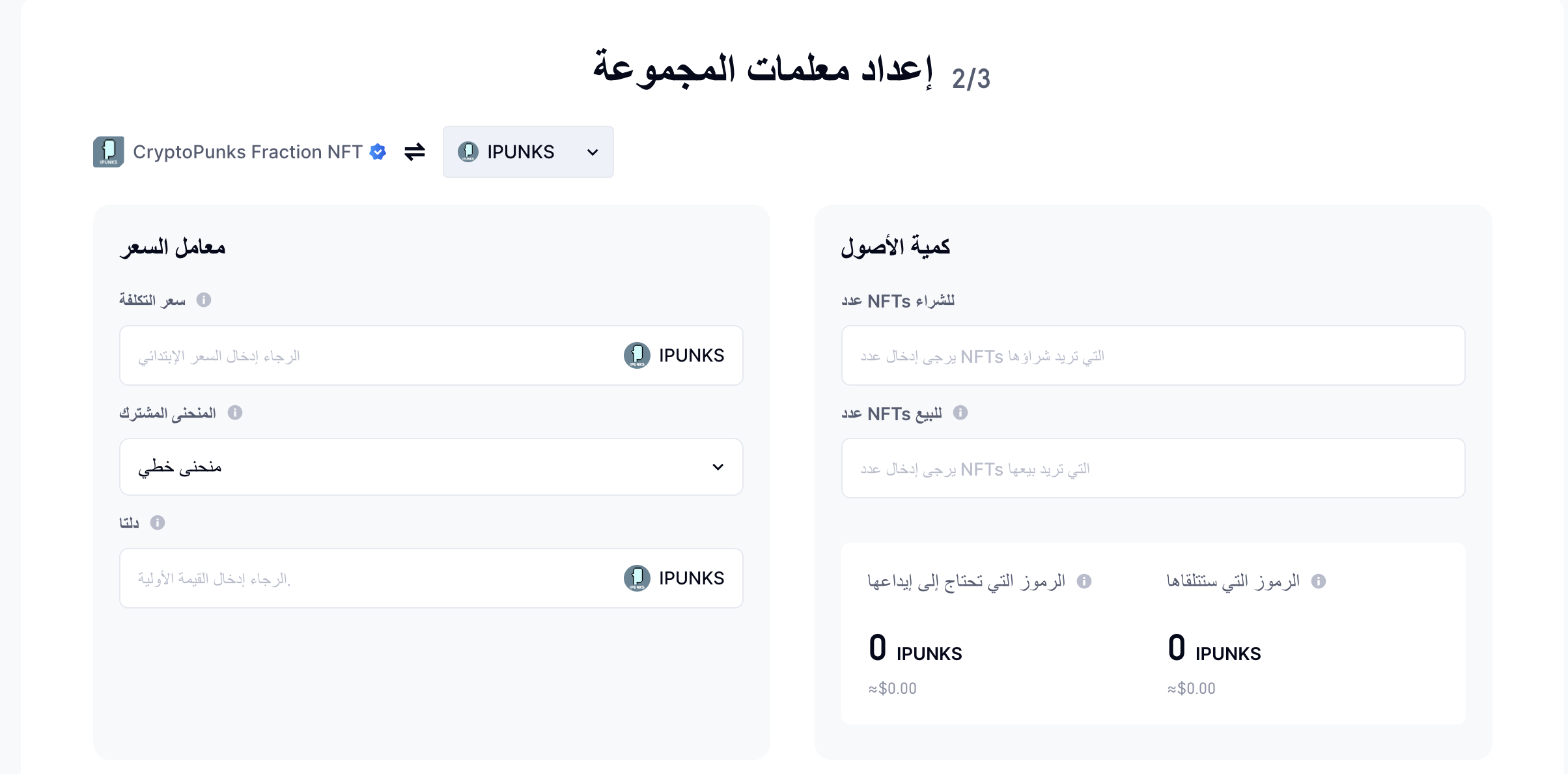 النصف الأيسر هو تحديد معلمات السعر. يعد إعداد المعلمة المعقولة هو المفتاح لتجمع السيولة الناجح. قم بتعيين حدود البيع والشراء، وسيقوم البروتوكول بحساب عدد NFTs والرموز المميزة المراد إيداعها. يمكنك عرض تكلفة وفائدة المعاملة من خلال النظر إلى منحنى السعر أدناه.