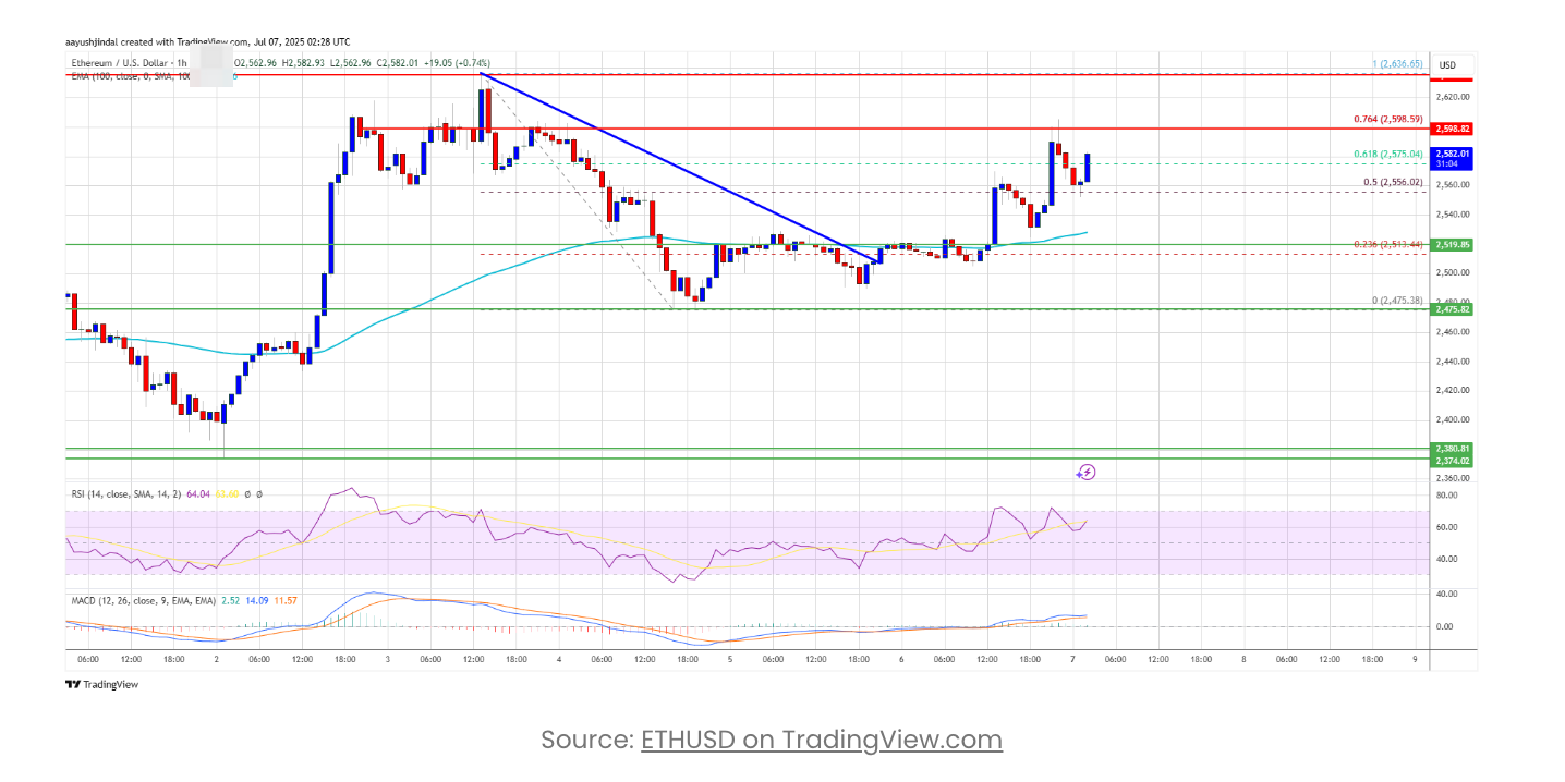 على الرسم البياني للساعة، تجاوز ETH/USD مستوى المقاومة لخط الاتجاه الهبوطي الرئيسي (قريب من 2520 دولار).