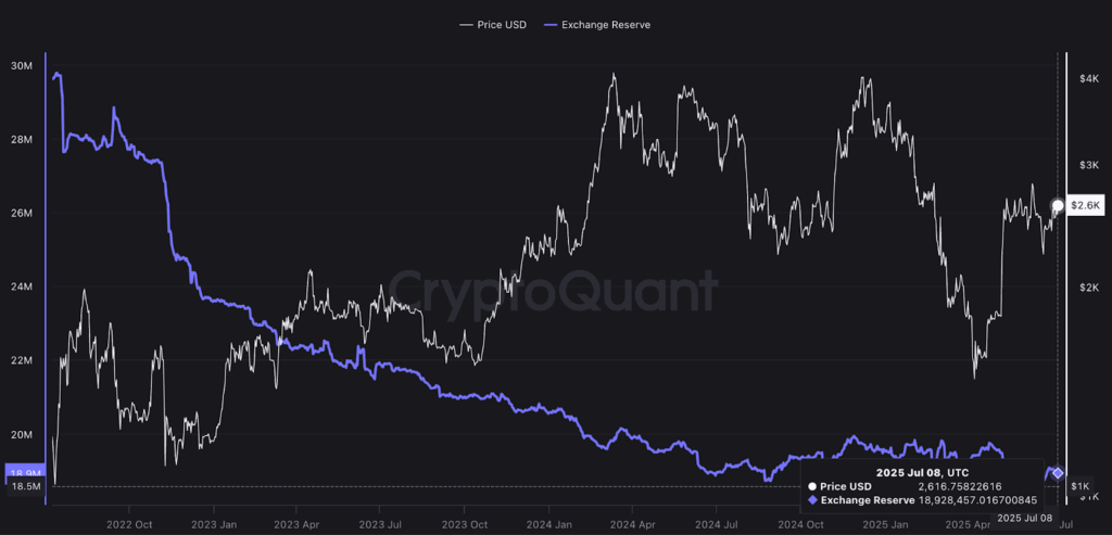 وفقًا لتقرير CryptoQuant، انخفض إجمالي احتياطي إثيريوم في التبادل إلى أقل من 19 مليون ETH. على الرغم من أن هذه ليست نقطة منخفضة مطلقة، إلا أنها عند أدنى مستوى تاريخي. في منتصف يونيو، انخفض الاحتياطي قليلاً، مما يشير إلى أن المتداولين لا يزالون غير مستعدين لإعادة ETH إلى التبادل.