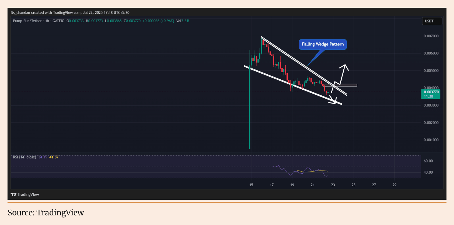وفقًا للتحليل الفني من AMBCrypto، فإن PUMP حاليًا في اتجاه هبوط، لكنه يبدو أنه يشكل نمط سعر صاعد. من خلال حركة الأسعار الأخيرة، يظهر الرسم البياني لأربع ساعات أن PUMP يشكل نموذج وتد هابط صاعد (bullish falling wedge)، حيث يقع السعر بالقرب من الحدود السفلية، مما يشير إلى احتمال ظهور زخم صاعد.
