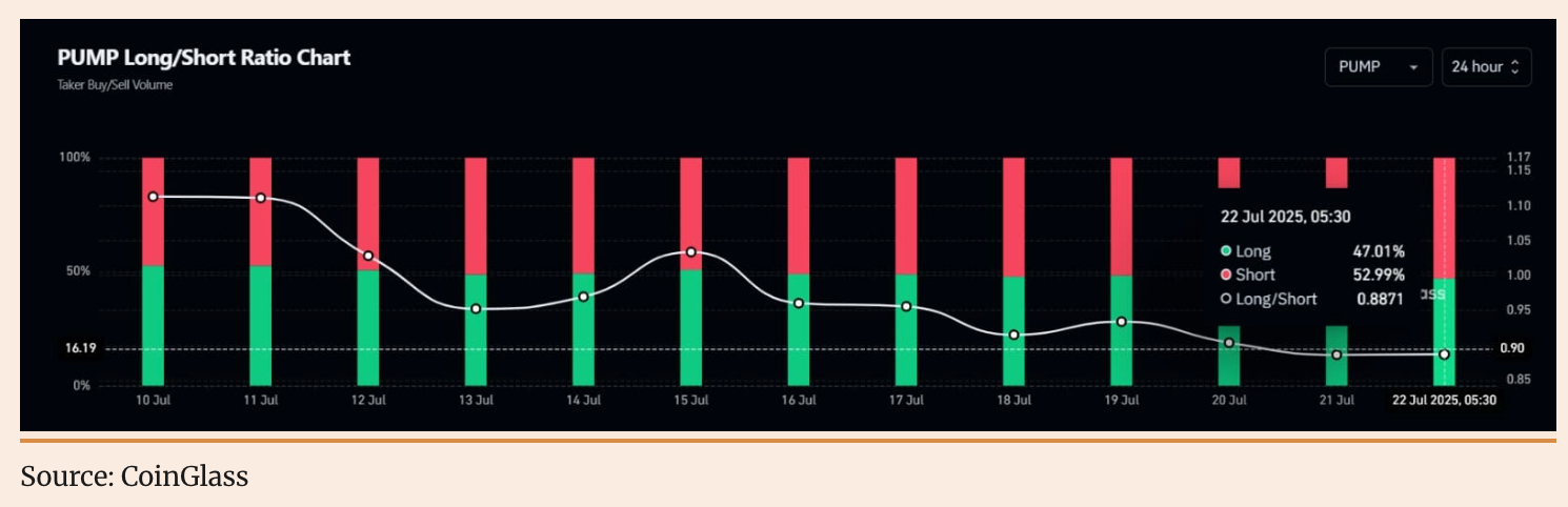 تشير البيانات إلى أن نسبة Long/Short لـ PUMP هي 0.88، مما يدل على أن مشاعر المستثمرين تجاه الهبوط قوية إلى حد ما. في الوقت الحالي، يحتفظ 47% فقط من المتداولين بمراكز شراء، بينما يحتفظ 53% بمراكز بيع. بالاعتماد على هذه البيانات، يمكن ملاحظة أن البائعين على المكشوف يهيمنون على هذا الأصل. ومع ذلك، فإن التراكم المحتمل لـ PUMP قد يبطئ من وتيرة انخفاض الأسعار.