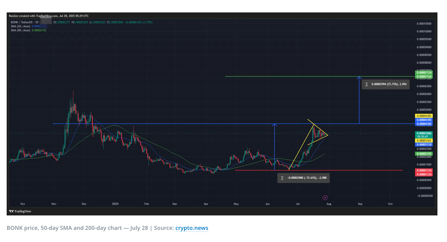 **تحليل الشكل: ** رسم بياني يومي ل BONK يقوم ببناء نمط مثلث متماثل ( Symmetrical Triangle Pattern )، وهذا هو شكل تنظيم مستمر يظهر بعد جولة قوية من الارتفاع (تسمى "العمود")، وعادة ما يشير إلى أن السعر سيستمر في الاتجاه الأصلي.