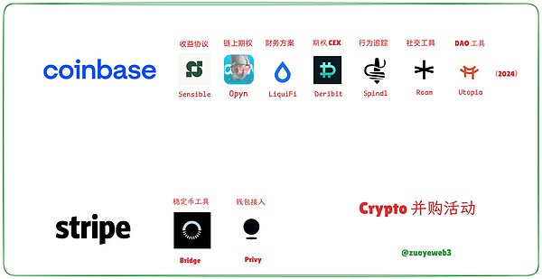 بجانب التمويل، بدأت العلامات التجارية في الصناعة أيضًا بالتشابك مع بعضها البعض، مما يتجلى في دورة الاستحواذ 2024-2025، حيث استحوذت Coinbase على Deribit لتكمل سوق الخيارات، واستحوذت Phantom على أداة المحفظة Bitski، ومنتجات الأمان Blowfish وأداة التداول SolSniper، وحتى Stripe تستحوذ على خدمة المحفظة Privy وأداة العملات المستقرة Bridge.