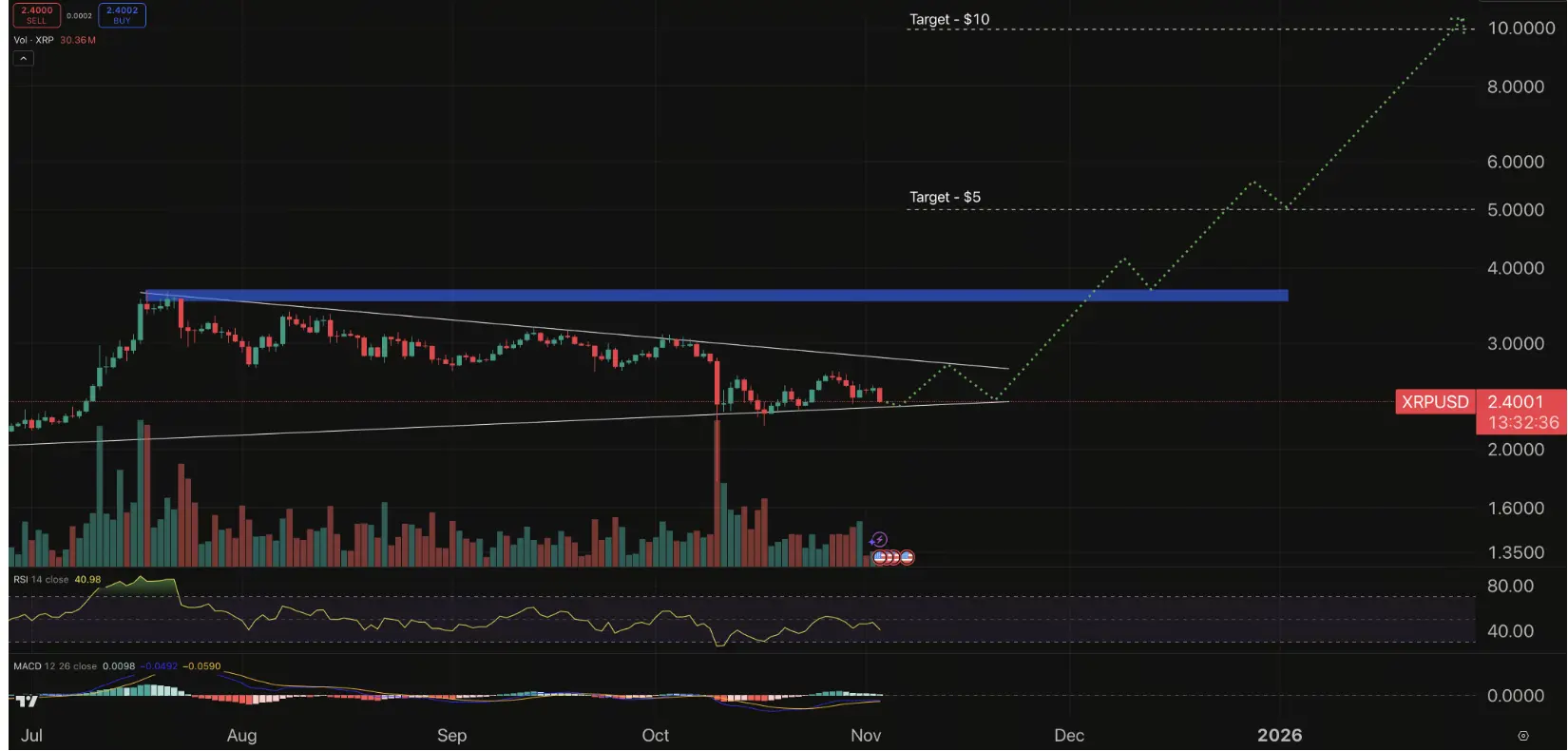 انخفض XRP بنسبة 5% في الـ 24 ساعة الماضية، ويبلغ سعره الحالي حوالي 2.40، مع انخفاض أسبوعي بنسبة 8% وانخفاض شهري بنسبة 20%. على الرغم من الضغوط قصيرة المدى، إلا أن ارتفاعه السنوي لا يزال مرتفعًا بنسبة 375%، مما يبرز الأساس القوي للزخم على المدى المتوسط والطويل.