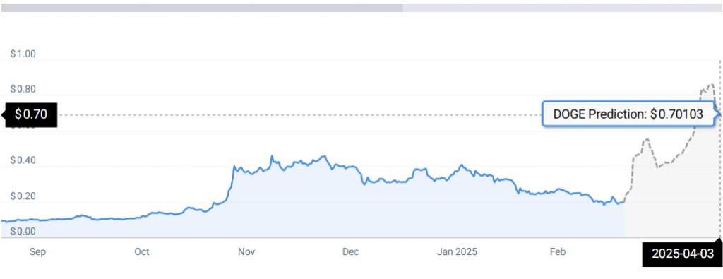 وفقًا لـ CoinCodex، قد يرتفع DOGE ليصل إلى أعلى مستوى جديد بقيمة 0.68 دولار بحلول نهاية مارس 2025.