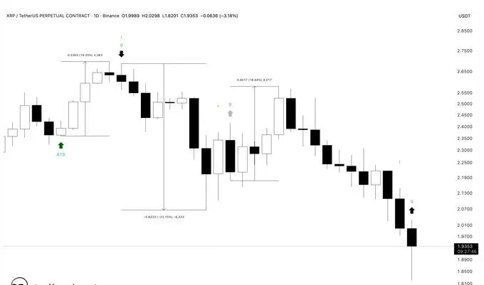 يأتي الإعداد الفني بينما تتداول XRP بالقرب من منطقة 1.95 دولار بعد أسبوع من ضغط البيع المستمر.