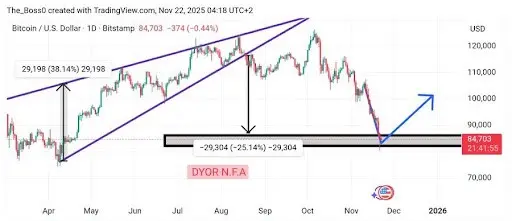المصدر: CryptoNewsNet العنوان الأصلي: بيتكوين تصل إلى نقطة تحول رئيسية مع كسر الوتد الصاعد الرابط الأصلي: https://cryptonews.net/news/bitcoin/32030257/ البيتكوين الآن في واحدة من أكثر نقاط التحول حرجًا في الدورة بأكملها. لقد أدى انهيار الوتر الصاعد إلى دفع السعر مباشرة إلى منطقة دعم رئيسية تمامًا كما تسجل BTC أول تراجع كبير لها بعد ATH بأكثر من 33%، وهو مستوى كان قد أشار تاريخيًا إلى ضعف طويل الأمد وزيادة التقلبات. مع تصادم الضغط الفني مع عتبة ذات أهمية تاريخية، يواجه السوق الآن لحظة حاسمة.