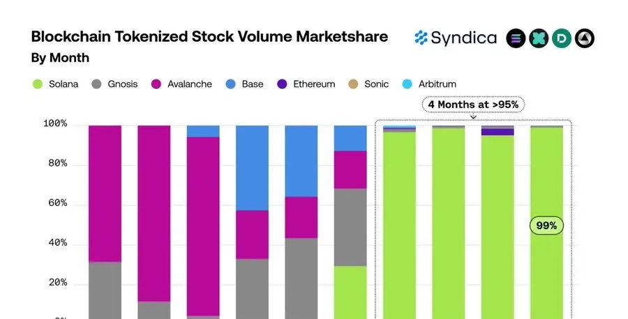 بدءًا من يوليو 2025، يتمدد حصة سولانا لتصل إلى استحواذ شبه كامل. تمثل الأعمدة الخضراء التي تمثل سولانا تقريبًا عبر يوليو وأغسطس وسبتمبر وأكتوبر، حيث تتجاوز كل منها عتبة 95%. لا تُظهر الشبكات المتنافسة أكثر من شريحة صغيرة من النشاط خلال هذه الفترة، مما يوضح مدى حسم سولانا في استحواذها على التدفقات عبر منصات الأسهم المرمزة مثل xStocks وDinari وBacked.