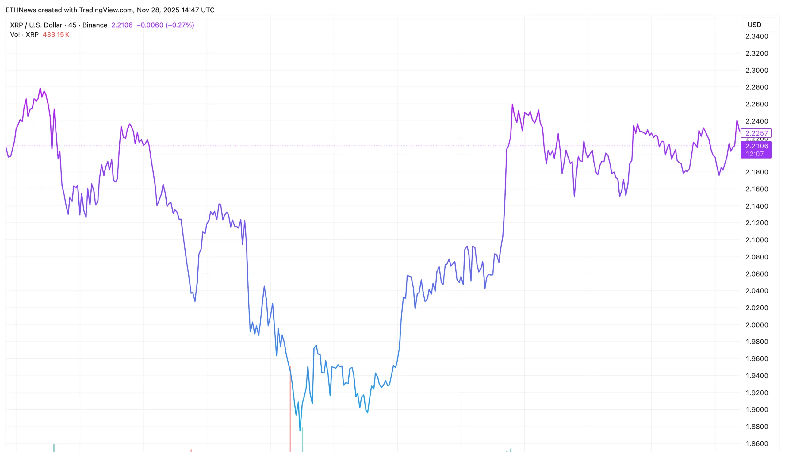 شهدت تقلبات XRP الشديدة على مدار العشرة أيام الماضية حركة سوقية ملحوظة. انزلق السوق بشكل حاد من 17 إلى 21 نوفمبر، م breaking أسفل 2.00 دولار ووصل إلى مستويات قريبة من 1.94 دولار. كانت تلك الحركة تشبه فتيلة الاستسلام التي تُرى عادةً في نهاية مراحل التصحيح التي تستمر لعدة أسابيع.