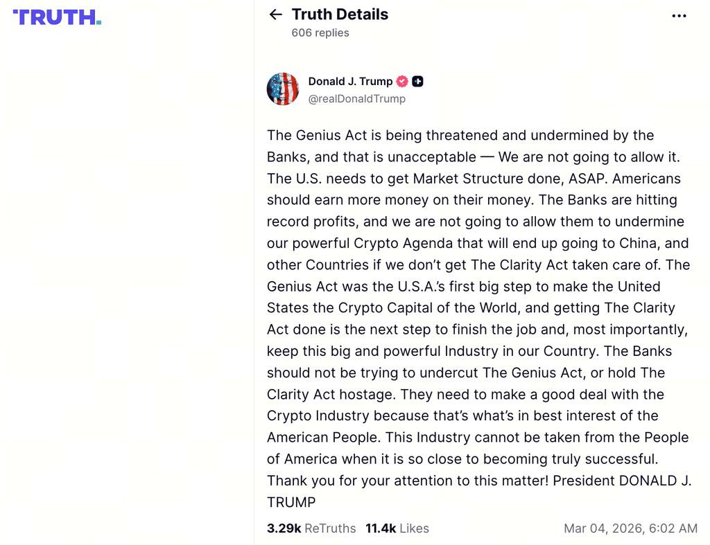 البيان الرئيسي: “يجب ألا تحاول البنوك إضعاف قانون GENIUS أو احتجاز قانون CLARITY رهينة لتقدم قانون CLARITY.” يربط هذا السرد صناعة العملات الرقمية ب “مصالح الشعب الأمريكي”، ويصور صناعة البنوك كاحتكار لمصالح خاصة.