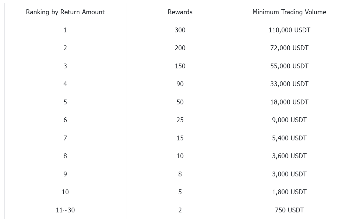Все пользователи, которые ранее торговали на платформе Торговых Ботов, могут снова торговать с помощью торговых ботов в течение периода активности! 30 лучших участников по сумме дохода получат следующие вознаграждения,