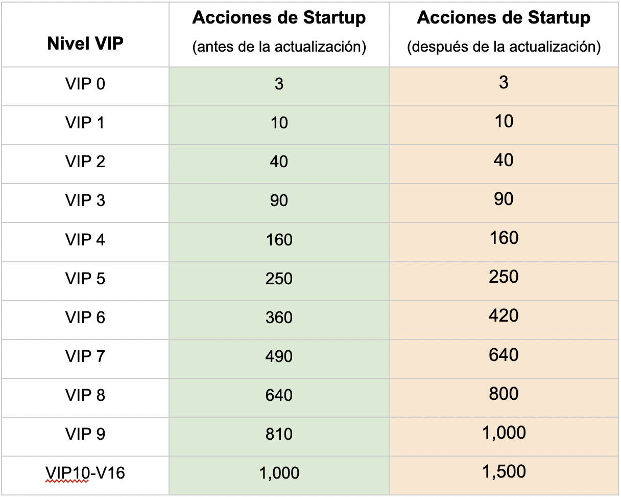 La actualización aumenta las acciones de Startup que los VIP pueden reclamar. Cuanto más alto sea el nivel VIP, más acciones podrán reclamar. Más información:
