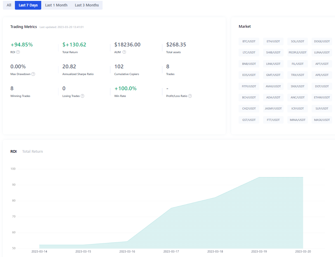 Lead Trader: Unrestrained Brother U G (Win rate: 100%; Max drawdown: 0.00%;ROI: 94.85%)