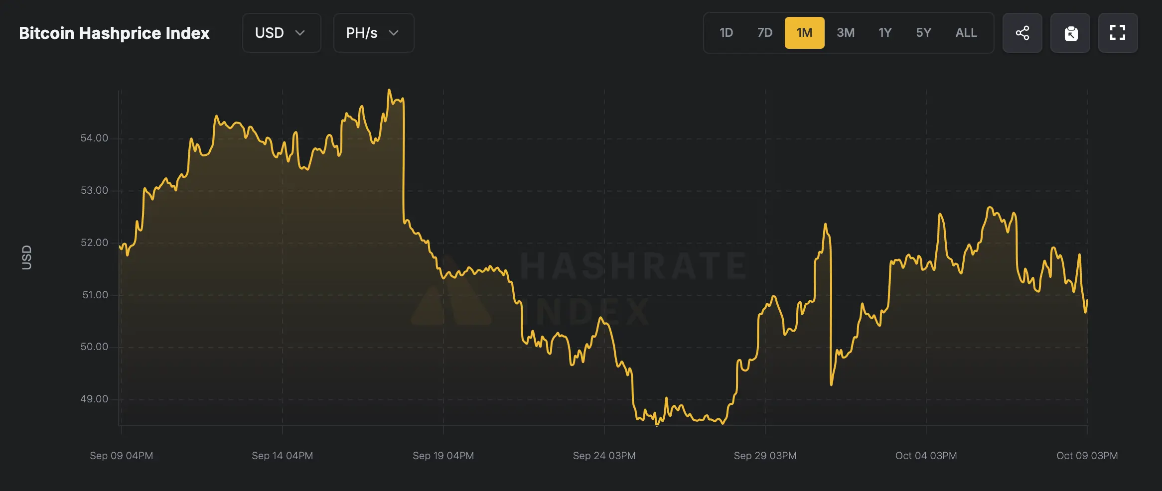 Los ingresos por minería mejoraron brevemente cuando el precio de bitcoin se disparó a nuevos máximos de precios a principios de esta semana, empujando el hashprice — el valor estimado de un PH/s — cerca de $53. En el momento de escribir, el hashprice se sitúa en aproximadamente $51.20, reflejando un ligero enfriamiento que aún sigue siendo favorable en comparación con meses anteriores.