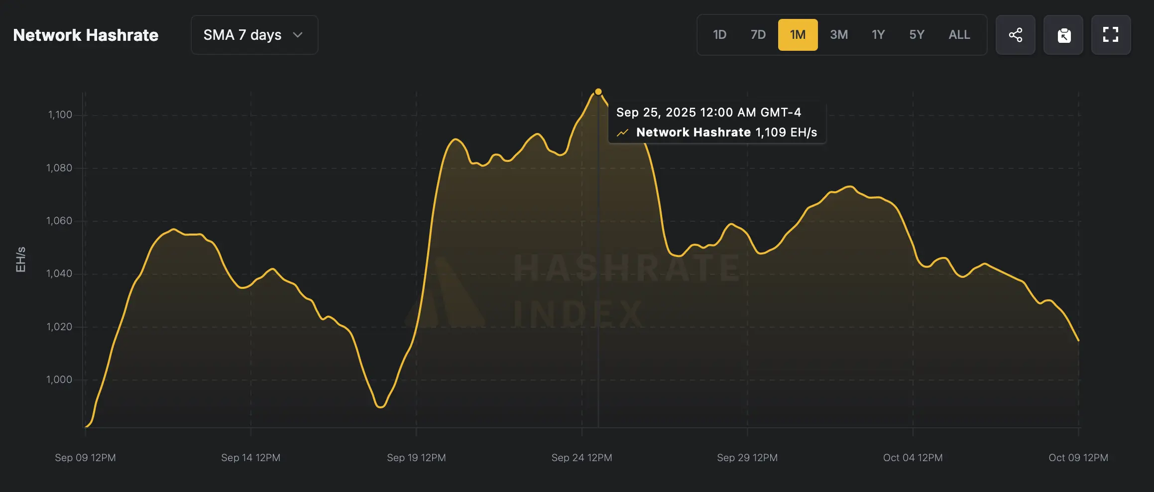 Hace aproximadamente dos semanas, el hashrate total de la red de Bitcoin alcanzó un pico récord de 1,109 EH/s, marcando el nivel más alto de poder computacional en su historia. Desde entonces, la fuerza de la red ha disminuido, con el hashrate actual oscilando alrededor de 1,011 EH/s, señalando una contracción medible en la actividad minera y la eficiencia de la red.