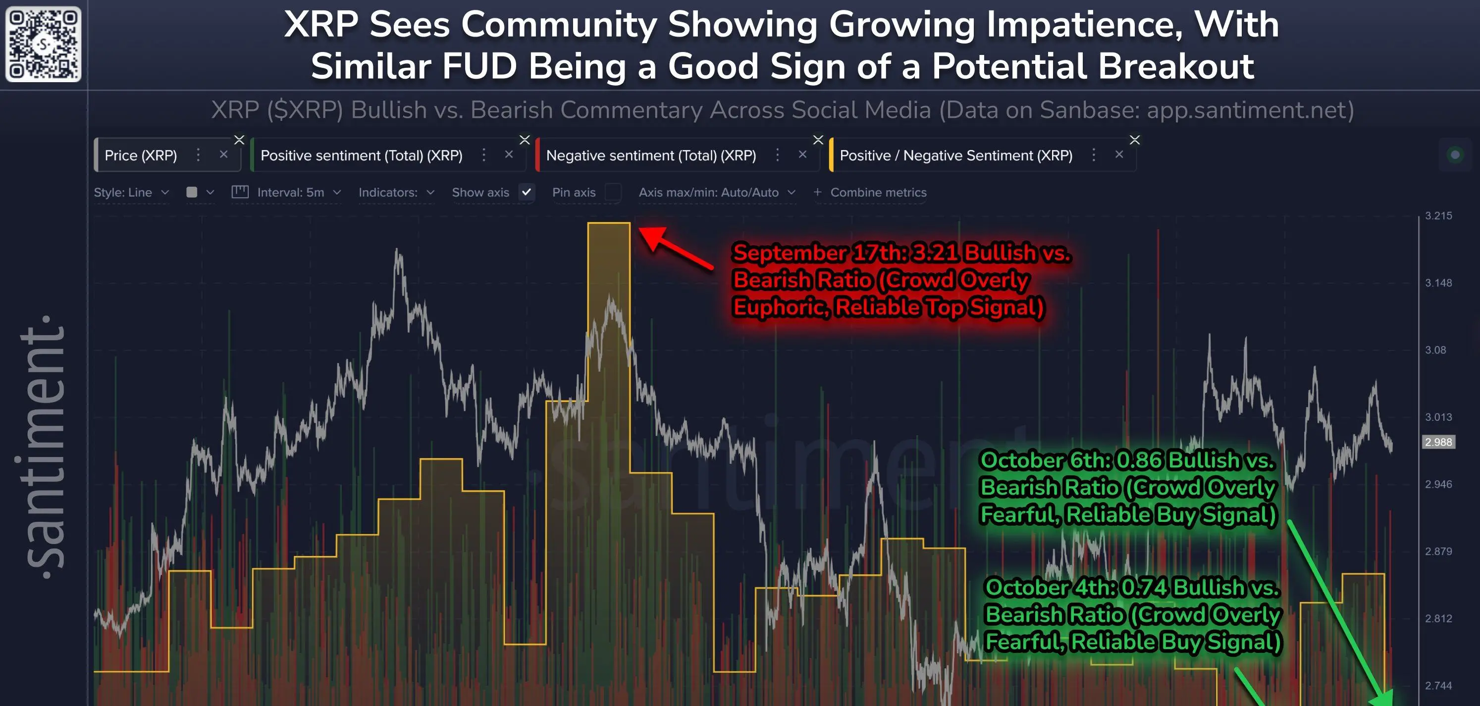 La relación de menciones positivas a negativas para XRP alcanzó un mínimo psicológico de 0.74 el 4 de octubre. Después de un ligero rebote, cayó nuevamente a 0.86 el lunes. Santiment considera que estos períodos de mayores menciones negativas son oportunidades de compra ideales para XRP, afirmando que "los mercados se mueven en oposición a las expectativas de los pequeños traders."
