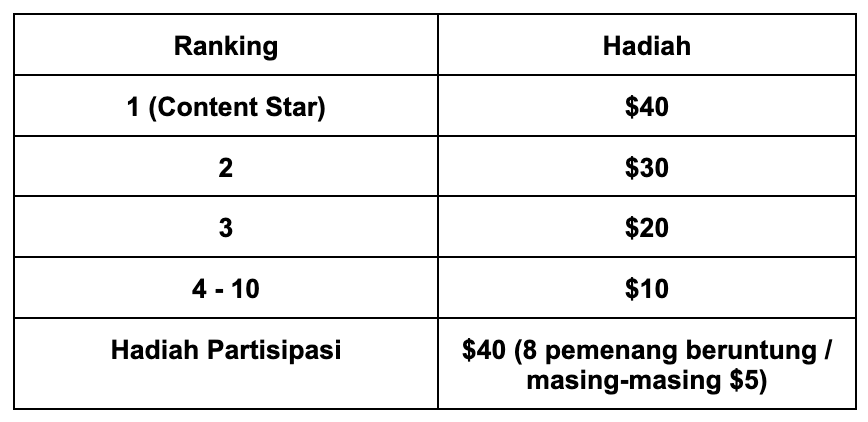Pour participer au prix du classement, les participants doivent publier au moins 10 contenus de qualité chaque semaine, et pour le prix de la participation, 4 publications sont le minimum requis.