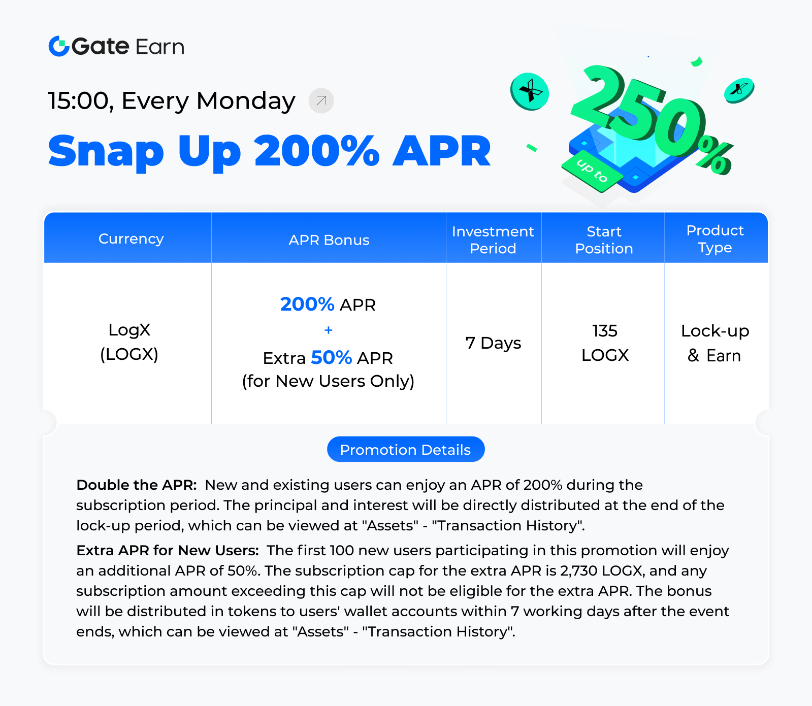 Gate Hodl & Earn propose chaque lundi un produit à haut rendement et à faible seuil avec une sécurité élevée, permettant à tous les utilisateurs de profiter d’un double revenu et d’un APR élevé! De plus, si vous êtes un nouvel utilisateur et que vous utilisez ce produit, vous pouvez obtenir un APR supplémentaire.
