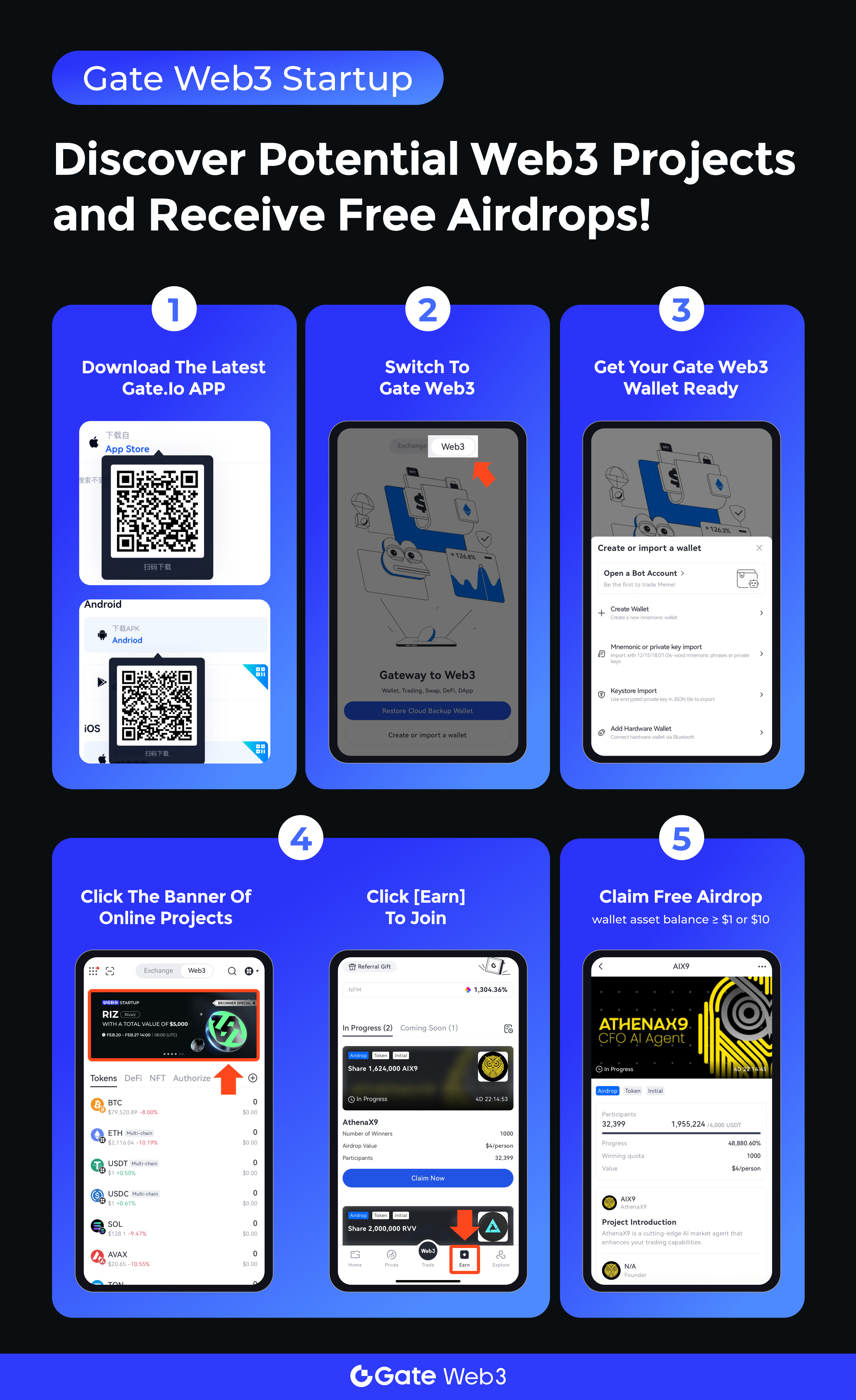 Pour fournir des commentaires sur le soutien des utilisateurs à la plateforme, Gate a officiellement lancé le "Gate Web3 Startup" le 3 juillet 2023 et mène occasionnellement des plans de largage aérien pour des projets blockchain. Les utilisateurs du portefeuille Gate Web3 peuvent recevoir des jetons, des NFT et des avantages de largage aérien de liste blanche en participant au Web3 Startup.