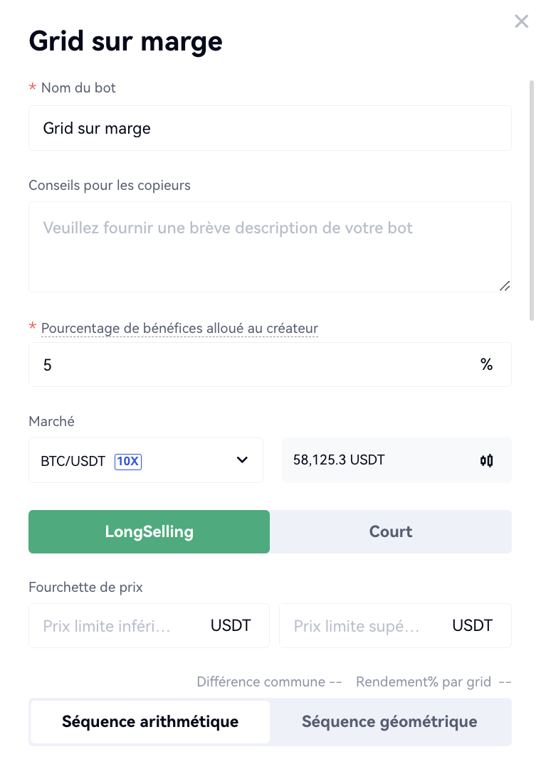 Prix de déclenchement de la stratégie : (Long) Les grilles ne sont exécutées que lorsque le dernier cours est inférieur ou égal au prix de déclenchement. Le prix de déclenchement doit être inférieur au dernier prix tout en étant compris entre le prix le plus bas et le prix le plus élevé dans les grilles ; (Short) Uniquement lorsque le dernier prix est supérieur ou égal au prix de déclenchement, les grilles seront exécutées. Le prix de déclenchement doit être supérieur au dernier prix tout en étant compris entre le prix le plus bas et le prix le plus élevé des grilles.