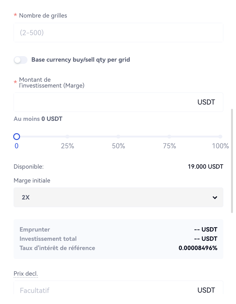 Les investisseurs qui souhaitent utiliser l'effet de levier pour amplifier les bénéfices sur la base de transactions en grille peuvent effectuer des opérations sur marge au moyen de stratégies de grille de marge. Les investisseurs n'ont pas besoin de surveiller le marché, car le système effectue automatiquement des transactions et des arbitrages en fonction des paramètres définis par les utilisateurs, ce qui garantit des rendements réguliers, même sur des marchés volatils. Margin Grid résout le problème de l'amplification des rendements dans les opérations sur marge.