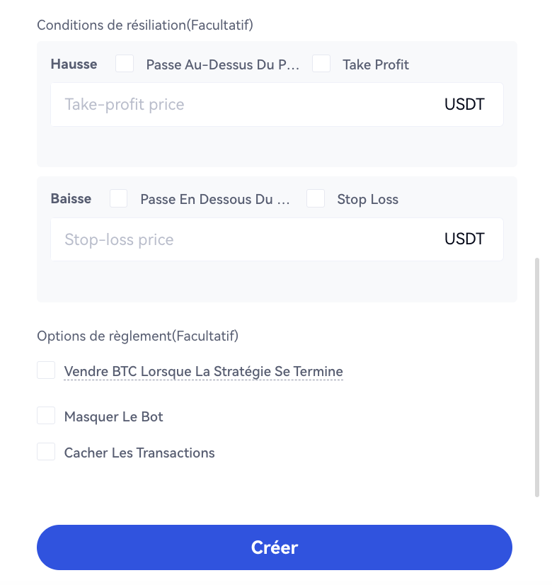 Vendre (devise de base) lorsqu'il se termine : Lorsque cette option est activée, vos avoirs seront utilisés pour acheter des USDT au prix du marché lorsque la stratégie se termine.