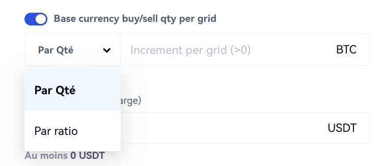 Incrément par grille : Désactivé par défaut. Lorsqu'elle est activée, la quantité achetée/vendue dans chaque grille augmente par quantité ou au prorata de la grille précédente.