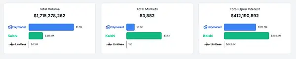Au 10 octobre 2025, d'après la comparaison des données entre Polymarket et Kalshi, en dehors du volume total des transactions où Polymarket écrase largement avec 1,3 milliard de dollars contre 410 millions de dollars, Polymarket est en retard par rapport à Kalshi en termes de nombre de marchés (10,2 milliers contre 43,5 milliers) et de volume des contrats non réglés (170 millions de dollars contre 240 millions de dollars).