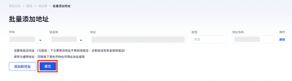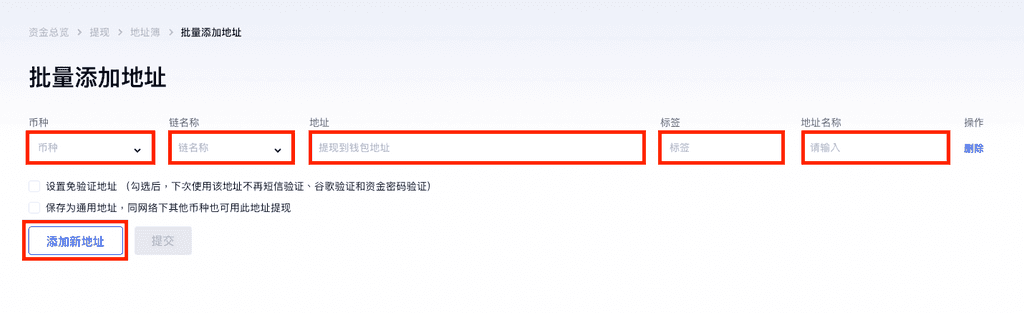 Adım 2. Coin, Zincir, Adres, Etiket (eğer yoksa, boş bırakın), Adres Açıklamasını girin. Ve daha fazla adres eklemek için "Yeni adres ekle" butonuna tıklayabilirsiniz.