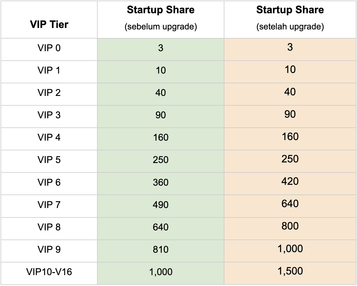 2.Pembaruan ini meningkatkan share Startup yang dapat diklaim oleh VIP. Semakin tinggi tingkat VIP, semakin banyak share yang dapat mereka klaim. Temukan detail lebih lanjut: