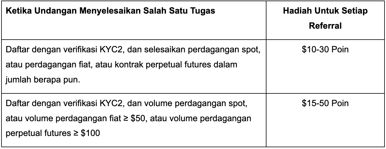 Undang pengguna baru untuk mendaftar dengan verifikasi KYC2 dan selesaikan tugas, dan Anda akan memenangkan hadiah dan menikmati komisi biaya perdagangan hingga 40% untuk setiap orang yang diundang.