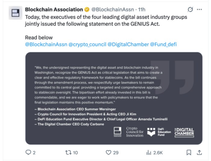 ! Kelompok lobi telah menyerukan agar proses tersebut tidak ditunda.Sumber: XTtelah mendorong para pemimpin Asosiasi Blockchain, Dewan Inovasi Crypto, Dana Pendidikan DeFi, dan Kamar Digital untuk mengeluarkan pernyataan bersama. Ini menyerukan 'anggota parlemen untuk tetap berkomitmen pada tujuan utamanya: memberikan pendekatan yang ditargetkan dan komprehensif untuk pengawasan stablecoin.'