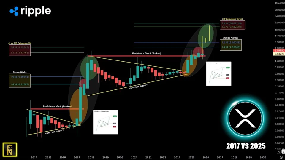 Analis grafik ChartNerdTA telah memberikan kerangka perbandingan sejarah yang lebih spesifik untuk prediksi harga XRP. Ia melakukan perbandingan mendetail antara harga XRP saat ini dengan pasar bullish astronomi tahun 2017, dan menemukan adanya kesamaan yang mengejutkan antara keduanya. Pada tahun 2017, XRP, setelah bertahun-tahun bergerak dalam rentang, menembus level resistensi jangka panjang dan terus meroket mendekati titik tertinggi sejarah hampir 4 dolar. Dari titik terendah saat itu, kenaikannya lebih dari ratusan kali lipat.