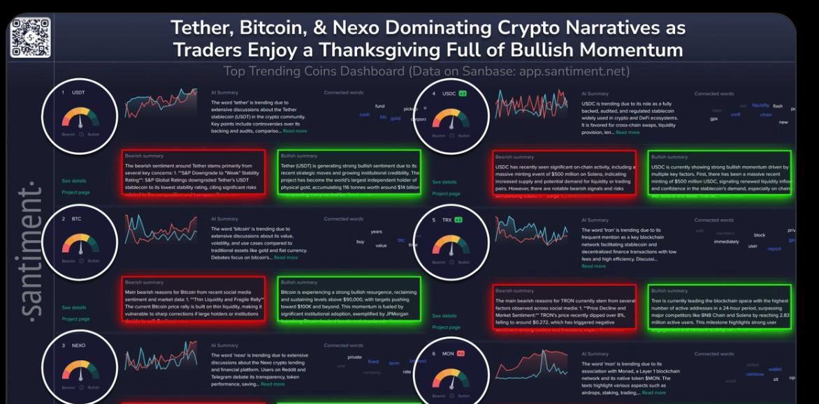 Saat Bitcoin bergerak kembali menuju wilayah $91,800 selama periode Thanksgiving, para trader kripto mengalihkan fokus mereka ke serangkaian narasi dominan yang dikenal. Dashboard tren Santiment menunjukkan bahwa USDT, BTC, dan Nexo menduduki posisi teratas, dengan diskusi mencakup stabilitas, likuiditas, kekhawatiran regulasi, dan aktivitas on-chain yang diperbarui. Momentum di sekitar aset-aset ini mencerminkan campuran kekuatan teknis, debat komunitas, dan optimisme pasar yang lebih luas seiring dengan membaiknya sentimen musiman.