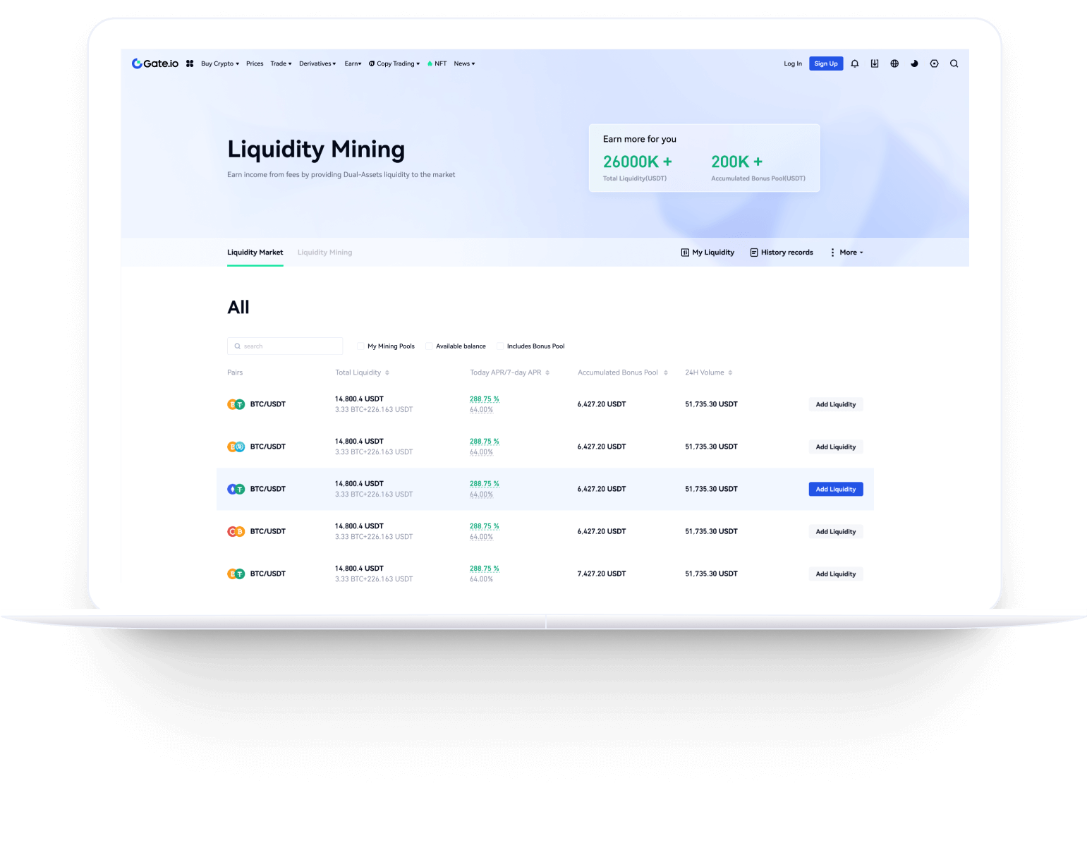 Lakukan sekarangSebagai produk HOLD & EARN yang menghasilkan pengembalian yang diperkirakan lebih tinggi, penambangan likuiditas bekerja sebagai berikut: Investor menyediakan likuiditas ke pasar dan menerima persentase dari biaya perdagangan sebagai pengembalian. Di Gate.io, penggunakan akan menerima 200% biaya perdagangan sebagai remunerasi, dan token GT sebagai bonus tambahan.