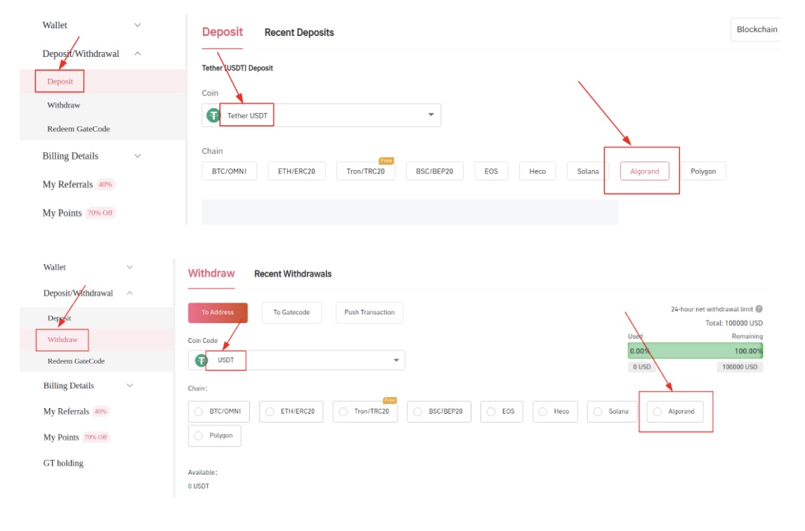 You can click on the link above, or click on the "Deposit" and "Withdrawal" of “wallet” on Gate, then you can choose USDT, and click on the "Algorand" network for top-up and withdrawal.