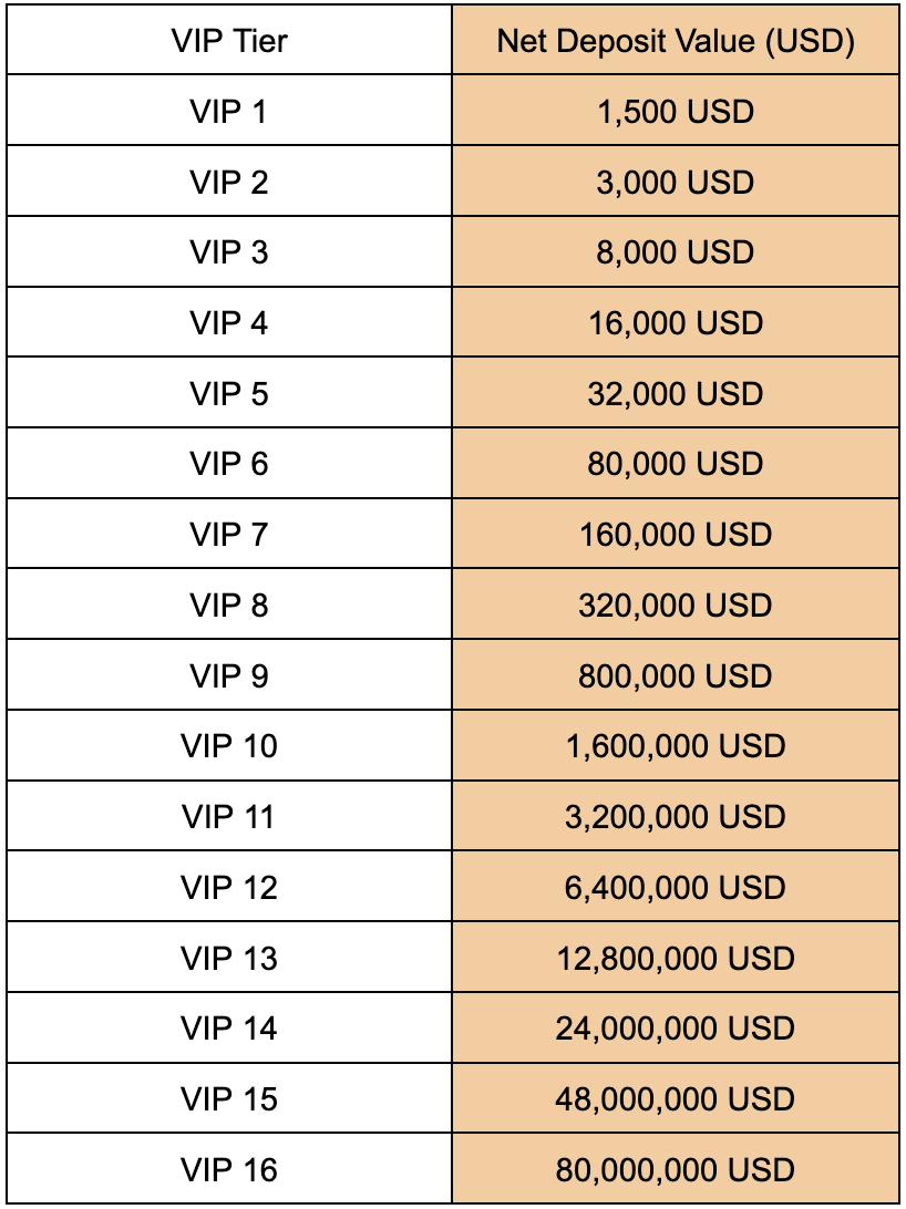 Users can deposit fewer assets than that of the standard requirement, yet get the same VIP tier respectively. View the form below.