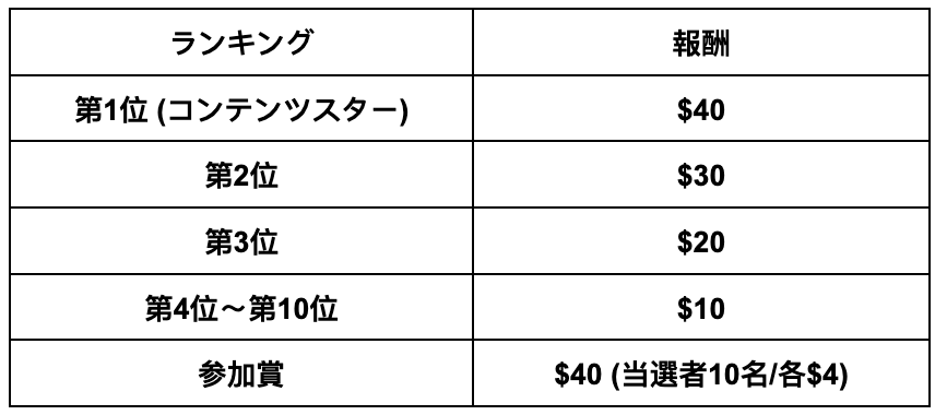 賞金は、リーダー賞と参加賞を用意しております。詳細は以下の通りです。