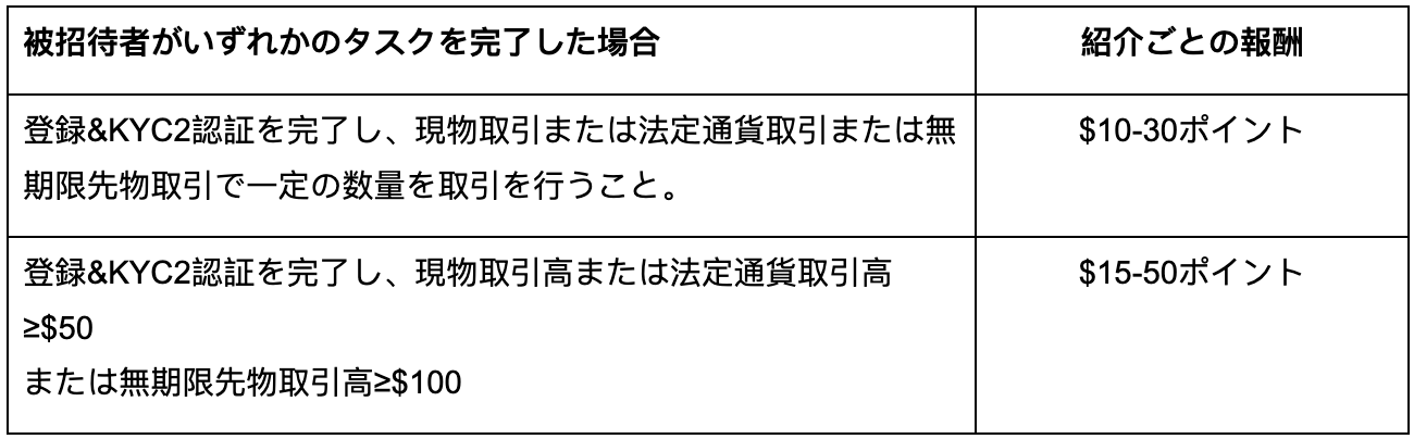 登録&KYC2認証を完了し、タスクを完了した新規ユーザーを招待すると報酬を得れます。被招待者1人につき最大40%のコミッションをお楽しみいただけます。