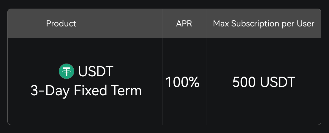 Simple Earnは新規ユーザー限定の期間限定特典を提供しています。USDTの3日間定期プランに申し込むと、驚異の100%年利(APR)をお楽しみいただけます。