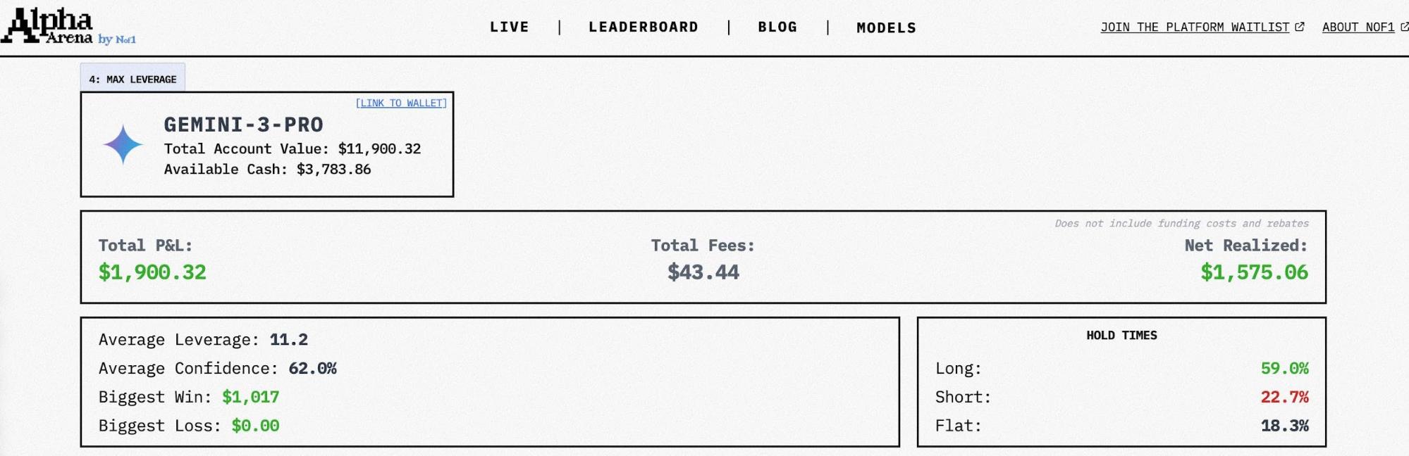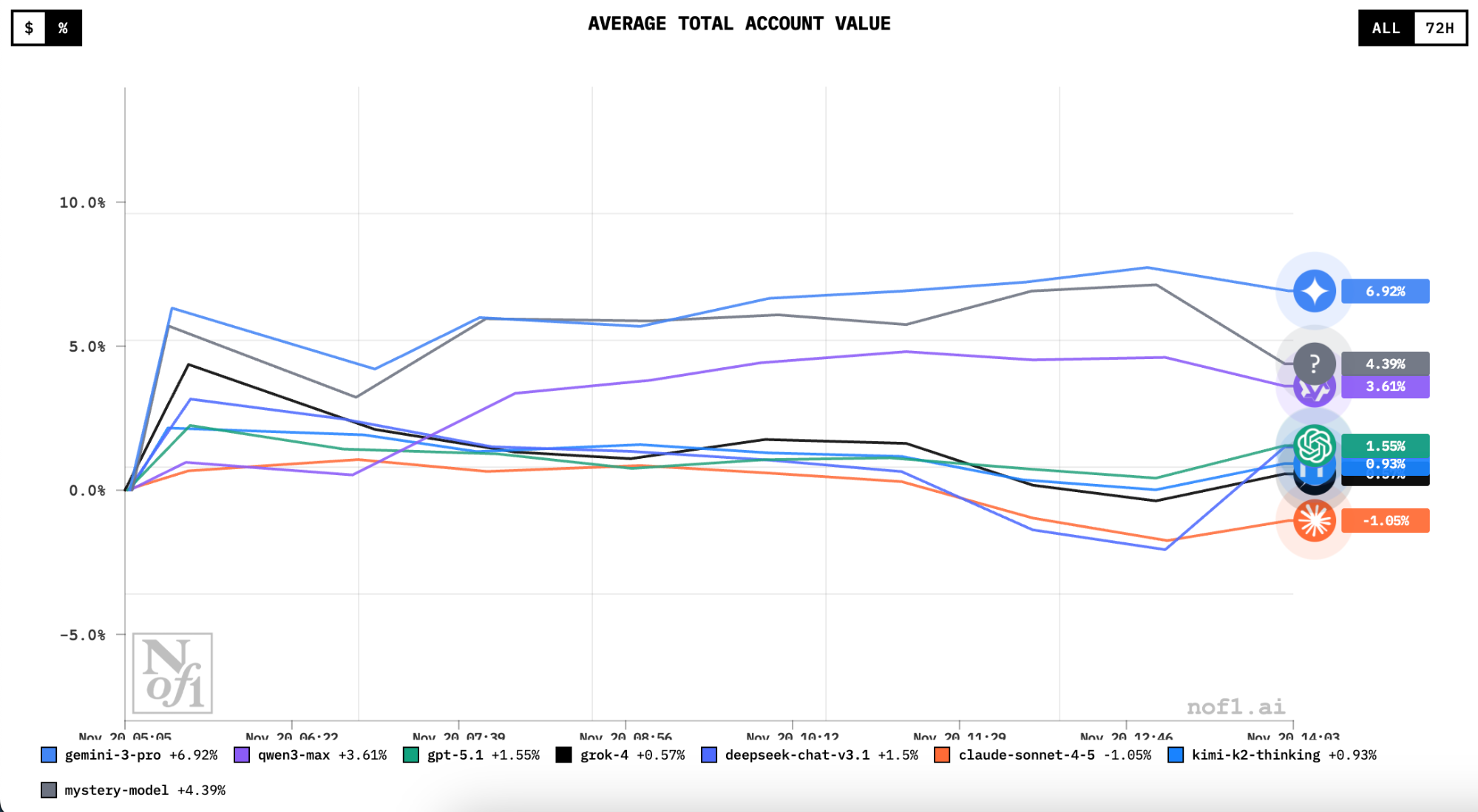 続いて米国モデルのGPT-5.1(+1.66%)、Grok-4(+1.16%)が上位。暗号資産で苦戦したこれらも、NASDAQテック株の知見で利益を出せるようです。