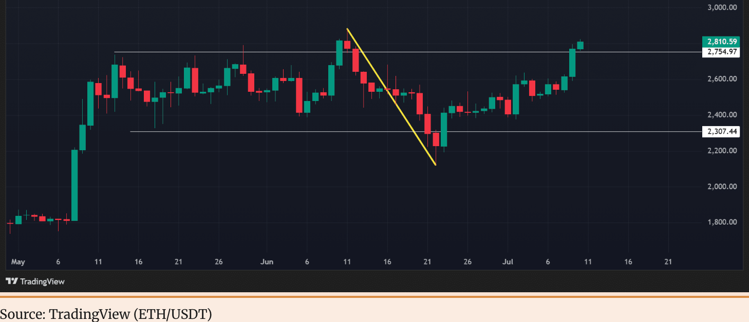 イーサリアムの上昇突破の理由が蓄積されている。価格はきれいに$2,815の抵抗レベルを突破した、モメンタム指標は$3,000**の関門をテストする可能性があることを示している。構造が維持されれば、**上昇トレンドは継続する見込みだ。